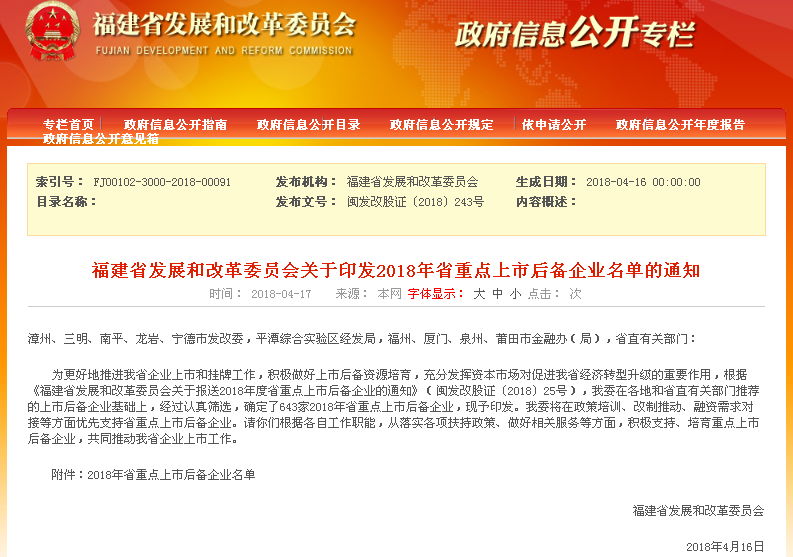 2018年4月16日,福建省發展改革委員會官網發布了《福建省發展和改革委員會關于印發2018年省重點上市后備企業名單的通知》,確定了福日電子參股企業福建福順微電子有限公司等643家2018年福建省重點上市后備企業。福建省發展改革委員會將在政策培訓、改制推動、融資需求對接等方面優先支持省重點上市后備企業,并要求各地市根據各自工作職能,從落實各項扶持政策、做好相關服務等方面,積極支持、培育重點上市后備企業,共同推動福建省企業上市工作。